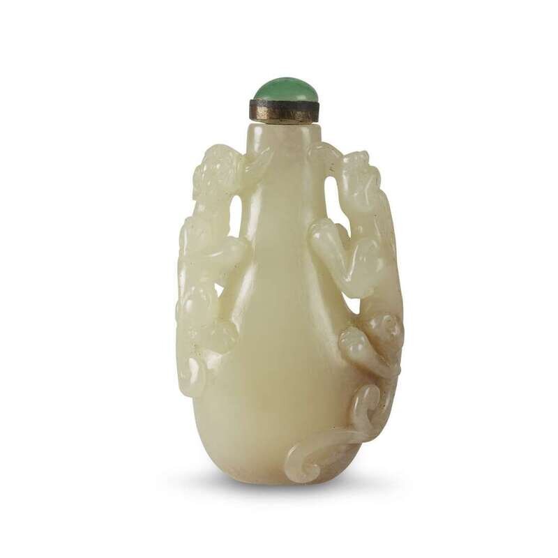 A Chinese carved creamy-white and beige jade "Two Qilong" snuff bottle