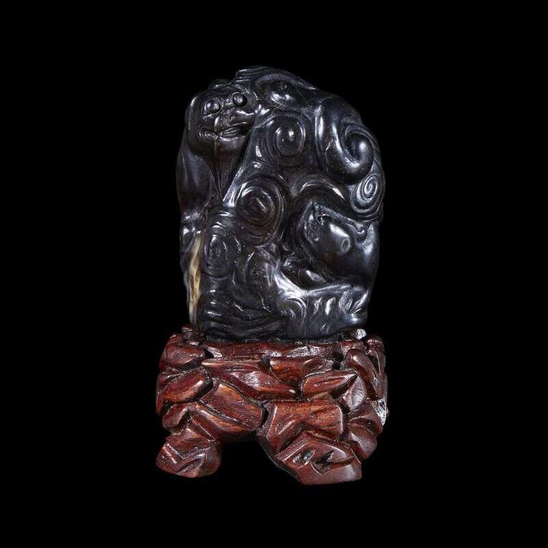 Carved with two bixie among dense scrolls.