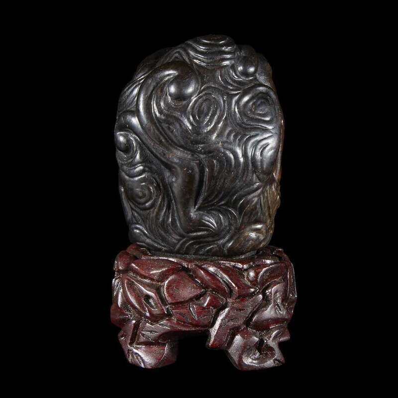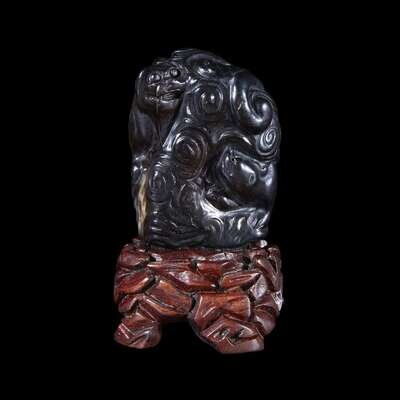 Carved dark brown and black jade finial possibly kangxi period, with later carved wood stand