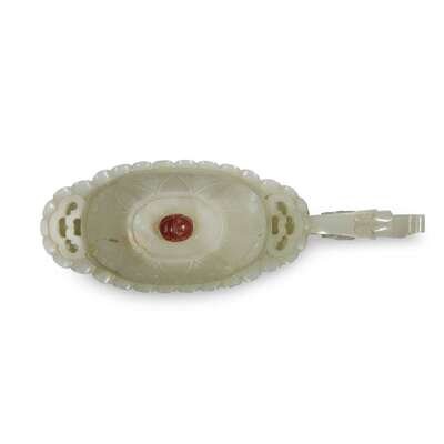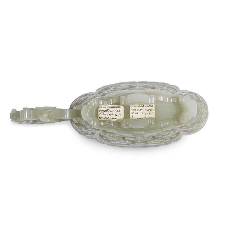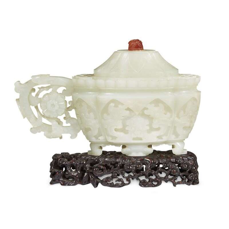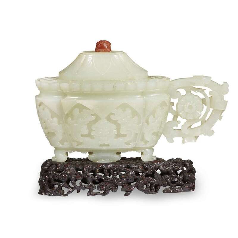Carved to show archaicized masks and stylized qilong within lappet panels, the subtly shaped "begonia blossom" lip finely incised with leiwen, as is the edge of the conforming cover, further incised with lappets, all raised on four stylized ruyi-head feet, the scrolled handle centered by a stylized floret, cover with a later carnelian pierced "scarab" finial; fitted wood stand; the stone with a pale celadon tint, with paler areas at the feet, sides, and end of lip, as well as to the cover; the later hardwood stand finely and elaborately carved with lingzhi and Buddha's-hand citron.