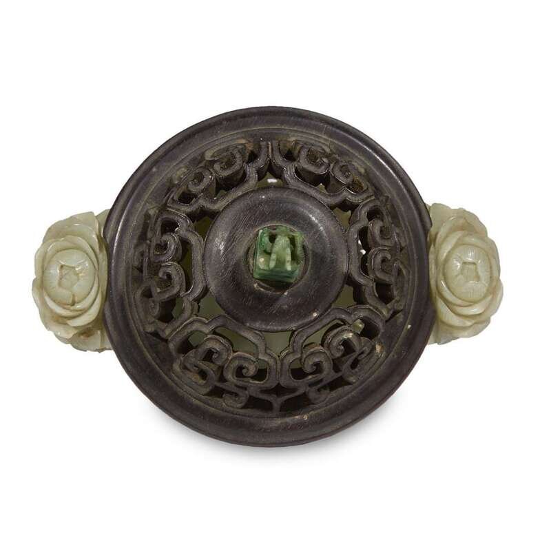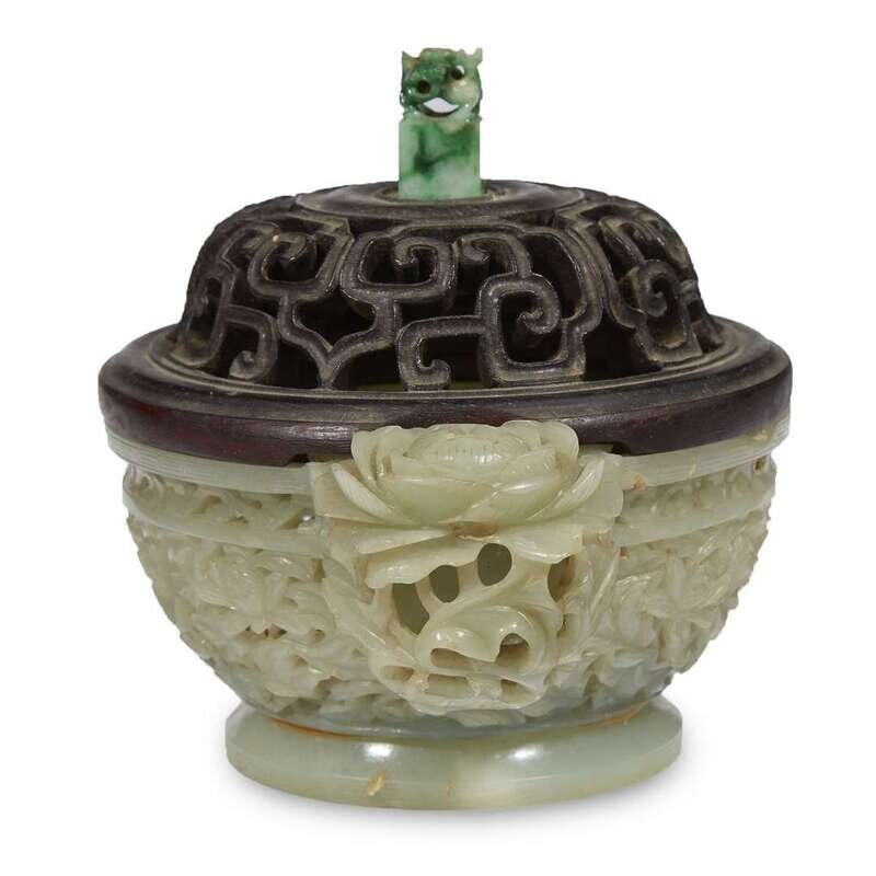 The circular censer carved with a wide band of peonies and foliage, the handles in the form of dense unfurling blossoms, the rim pierced with scrollwork, the edge of the foot and lip carved with leiwen, the later scroll-pierced hardwood cover surmounted by a small green and white jadeite "dragon" seal.