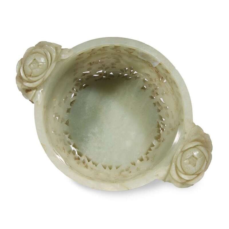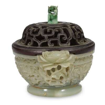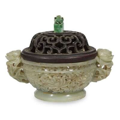 A Chinese reticulated celadon jade censer with carved hardwood cover the censer probably 18th century