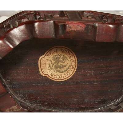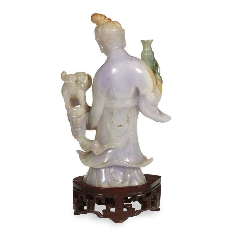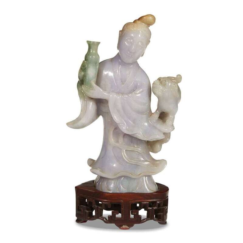 A Chinese carved lavender, green and russet jadeite meiren with vase and lion