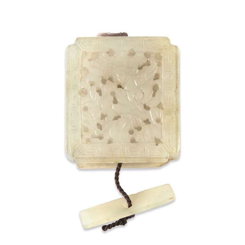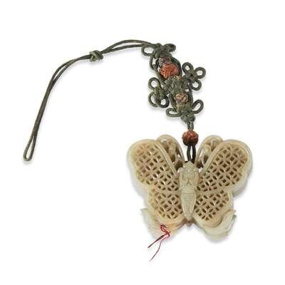 Comprising: a butterfly with knotted cord; a rectagular holder carved with exotic birds and lotus; an earring carved with stylized flower.