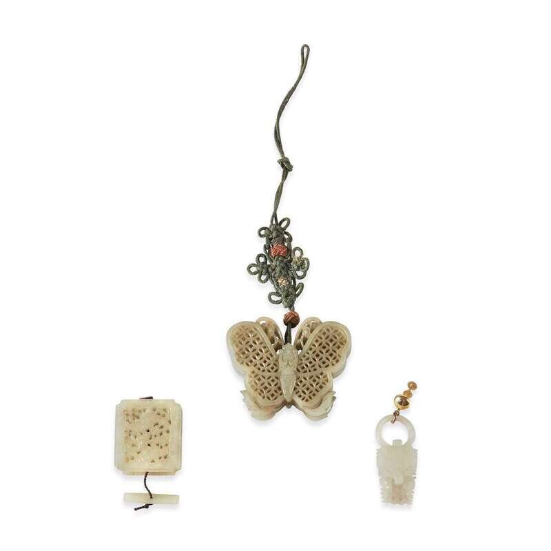 Two Chinese carved and reticulated greyish-white jade scent holders and a white jade earring the holders qing dynasty