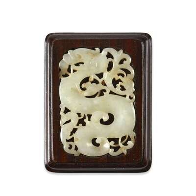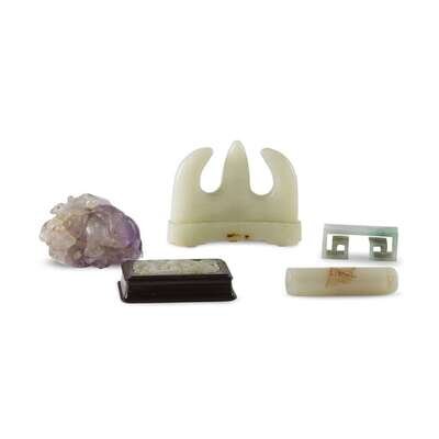 Comprising: a white jade "Shan"-form brush rest; a scrolled green and white jadeite inkrest; an amathyst "Shells and Waves" group; a white jade "Qilong and Scrolls" pendant in hardwood mount; a white jade plume holder.