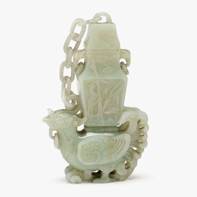 A Chinese carved celadon jade phoenix carrying a covered vase and chain connected cover 19th century