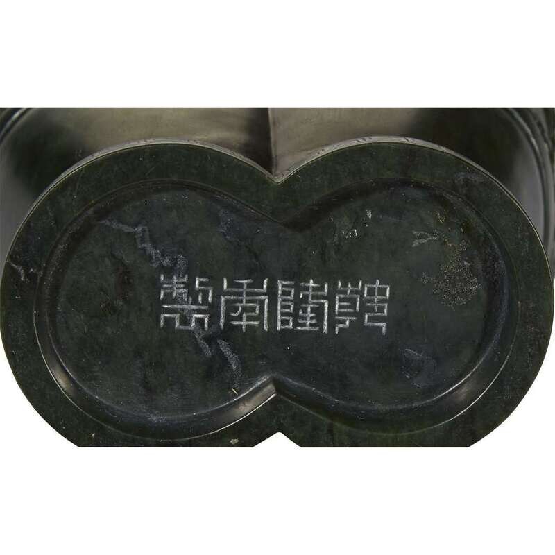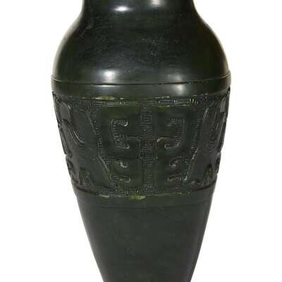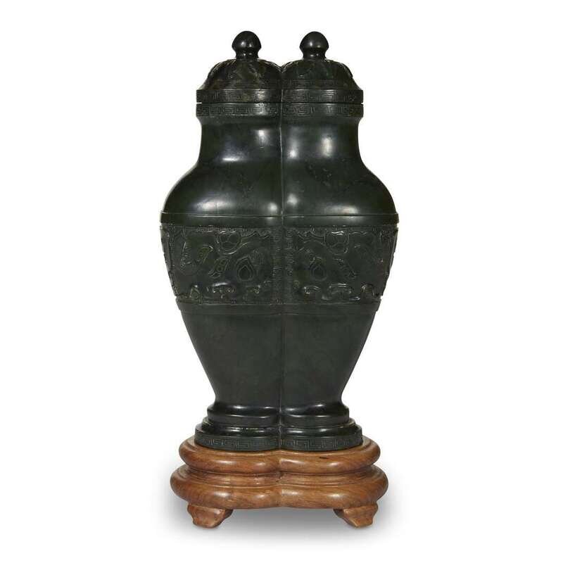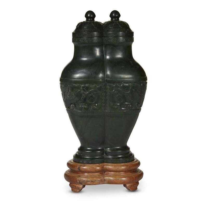 A Chinese spinach jade archaistic conjoined vase and cover with wood stand