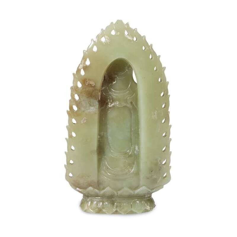 Seated on a lotus throne, bearing a vase in one hand, a flaming nibus behind, the stone of a even green with scattered beige, grey and white inclusions.