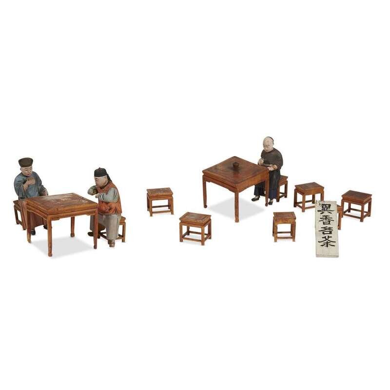 The two-story building with fretwork balcony and widow opening, furnished with two tables, three seated figures, and six stools, together with a second sign board reading "yixiangmingcha", the inside of the roof fitted for electricity.