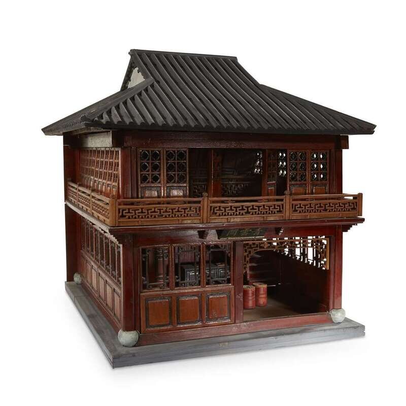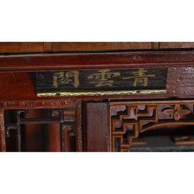 A carved and stained wood model of a Chinese tea house, "Qingyunge"