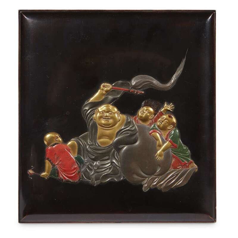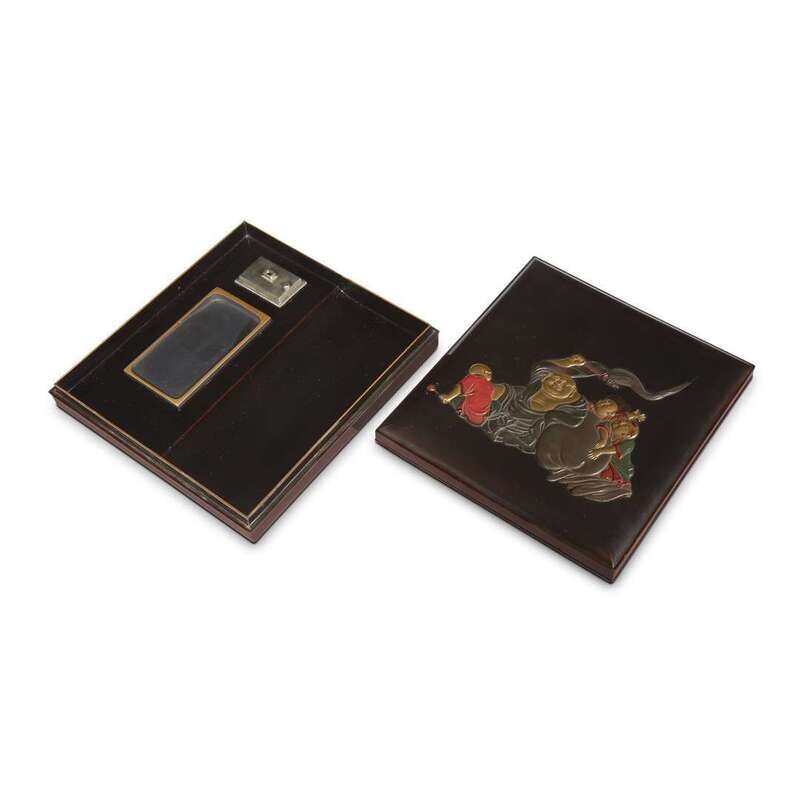 Of a square form, the cover depicts Hotei seated with his sack accompanied by three karako in gold, silver, and iroe takamaki-e on a black lacquer ground. LITERATURE: For a closely related box, see the example illustrated in Barbra Teri Okada, "A Sprinkling of Gold, the Lacquer Box Collection of Elaine Ehrenkranz", Newark, 1983, p. 128, no. 52.