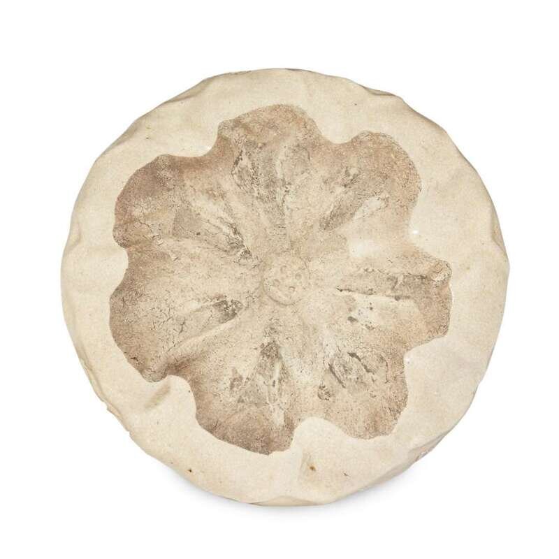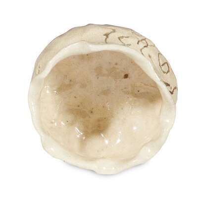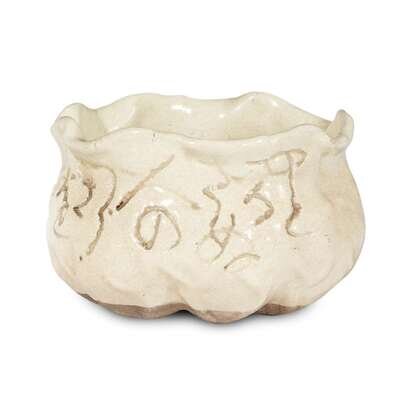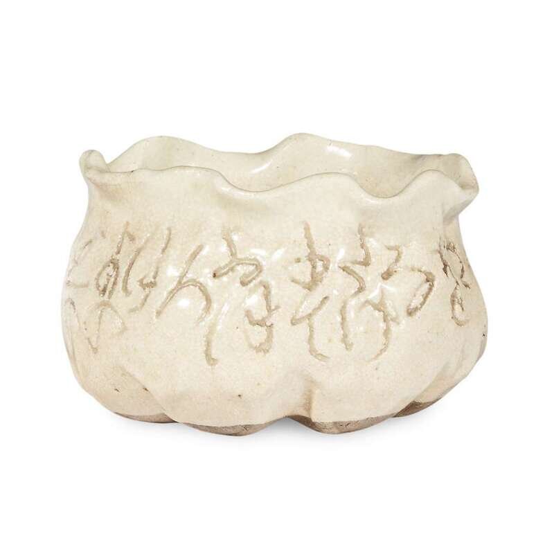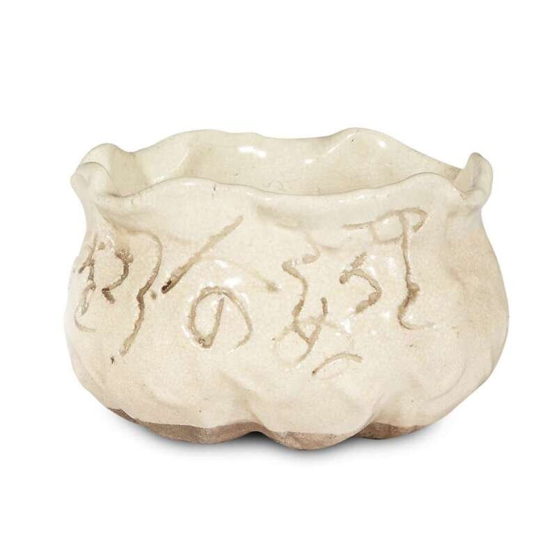 Modeled in the manner of Otagaki Rengetsu in the form of a stylized lotus leaf; finely cracked creamy glaze and incised with calligraphy around body.