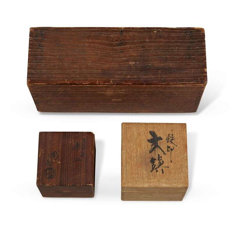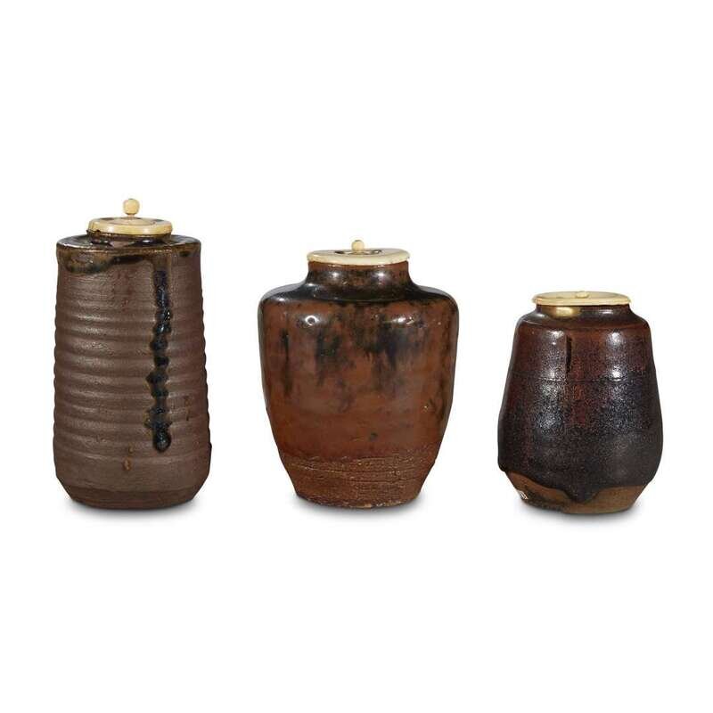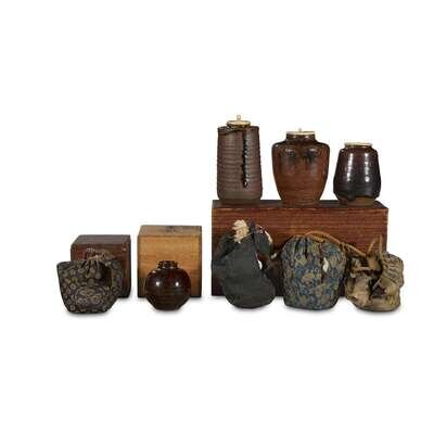 Comprising: an inscribed Japanese compartmented wood box with three embroidered shifuku; an inscribed wood box with a shifuku; an inscribed box with a small chaire of bunrin "apple" form, described as "Karamono" (Chinese); a ridged brown stoneware chaire, possibly Satsuma, 16th/17th-19th century, of katatsuki form, ivory cover; a dark-brown/black glazed Seto chaire of nasu "eggplant" form, 19th century, gold lacquer repair to lip, ivory cover; a black and brown-glazed Seto or Shigaraki chaire, 17th-19th century, ivory cover.