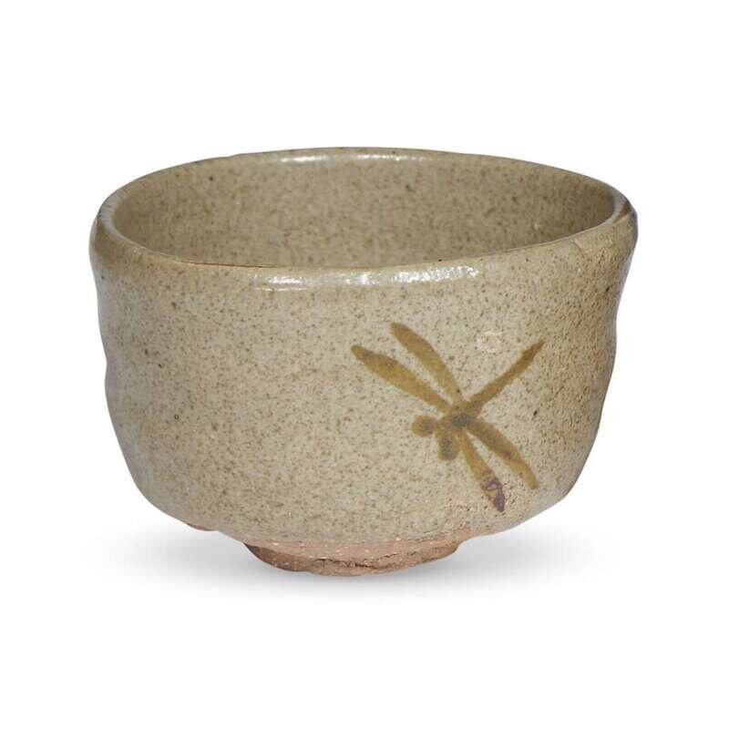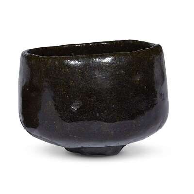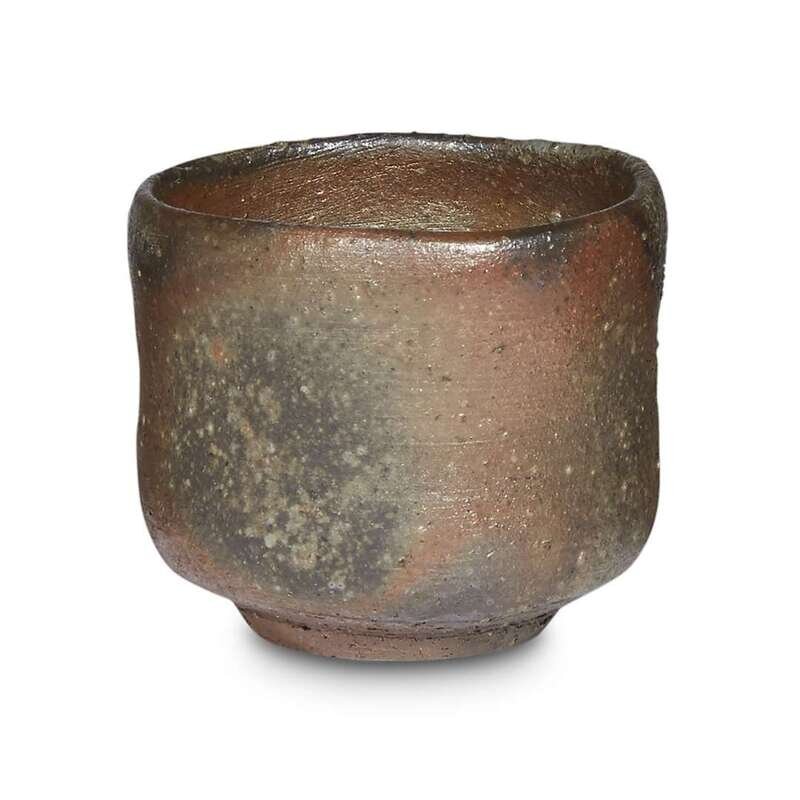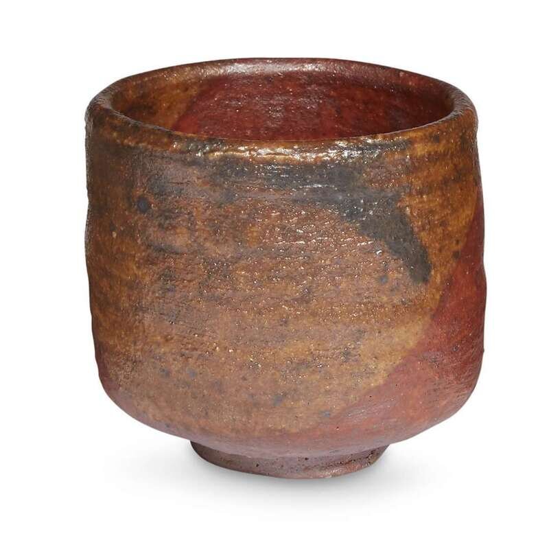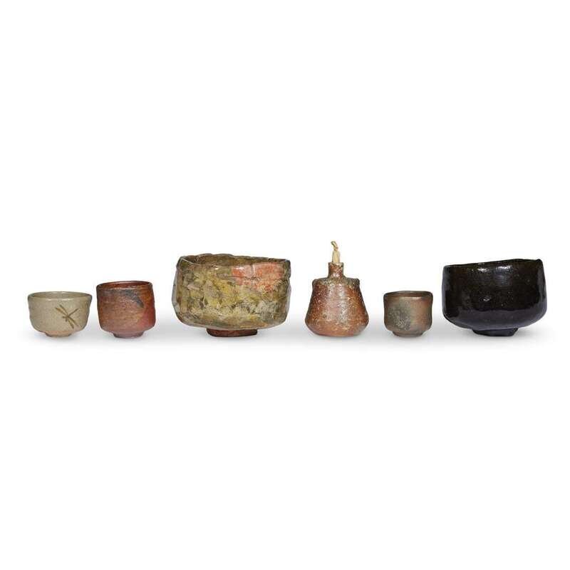 Comprising: a black-glazed raku bowl; an olive green-glazed raku bowl with orange patches on body, underside with incised and lacquer inscriptions; a reddish brown-glazed sake cup, impressed "To"; a Bizen russet-brown ash-glazed stoneware sake cup, probably early Edo, underside with incised mark, possibly "Ninsei"; a grey glazed sake cup painted with a dragonfly, stamped seal, possibly "To"; a Shigaraki orange to brown ash-glazed pastille holder.