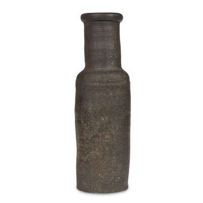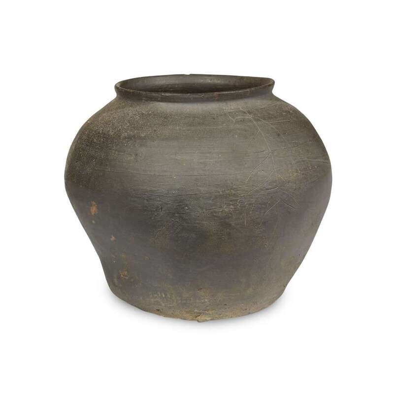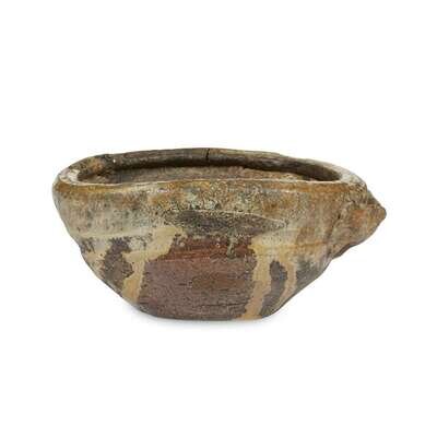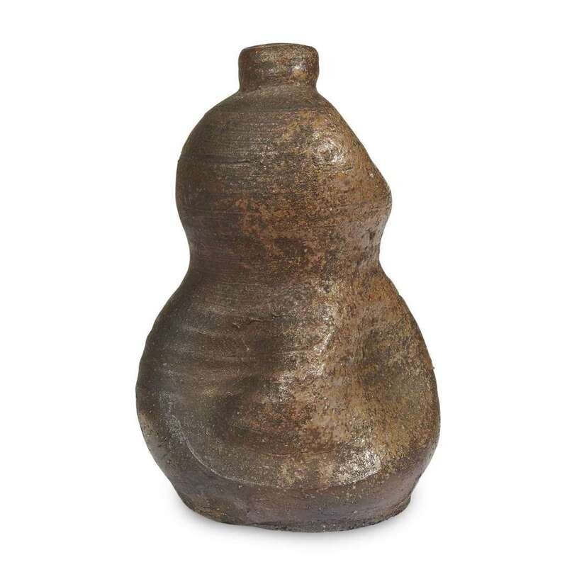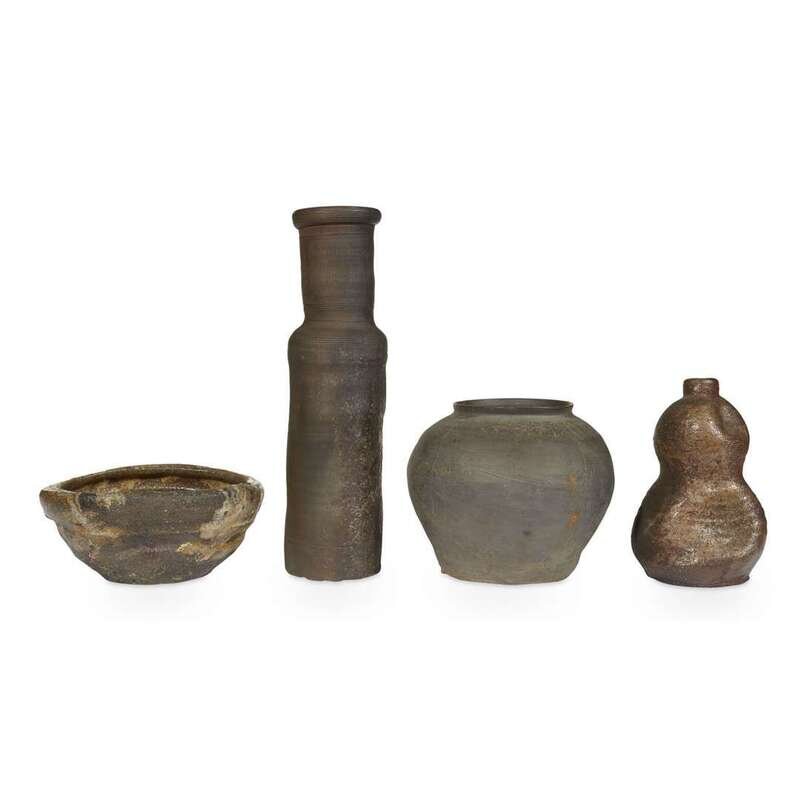 Comprising: a double-gourd shaped Bizen vase, possibly 16th/17th century with pinched and ridged body; a Bizen flower vase, possibly 16th/17th century, of flattened cylindrical form with a slightly narrower neck and rounded lip rim, incised with horizontal and vertical lines, signed to underside; a Korean wide-mouthed stoneware jar, Goryeo dynasty, with a globular body, incised with stylized feather design; a brown-glazed shallow pouring bowl with short, shaped spout, possibly ko Seto, inverted rim and pinched body, thick ash glaze.