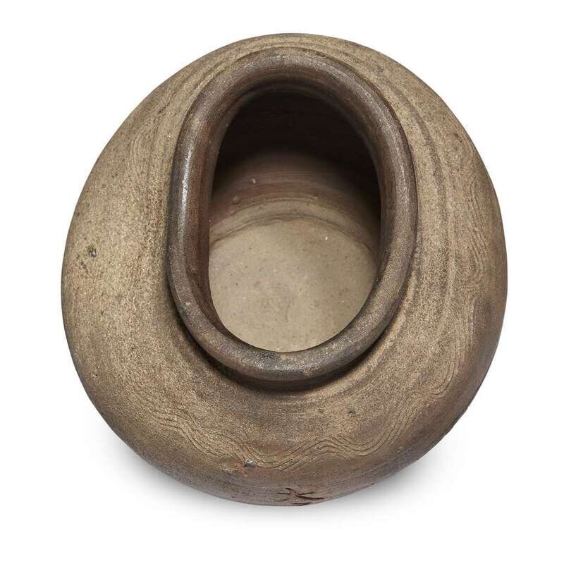 A Japanese stoneware mizusashi with pinched rim, probably Ko-Bizen