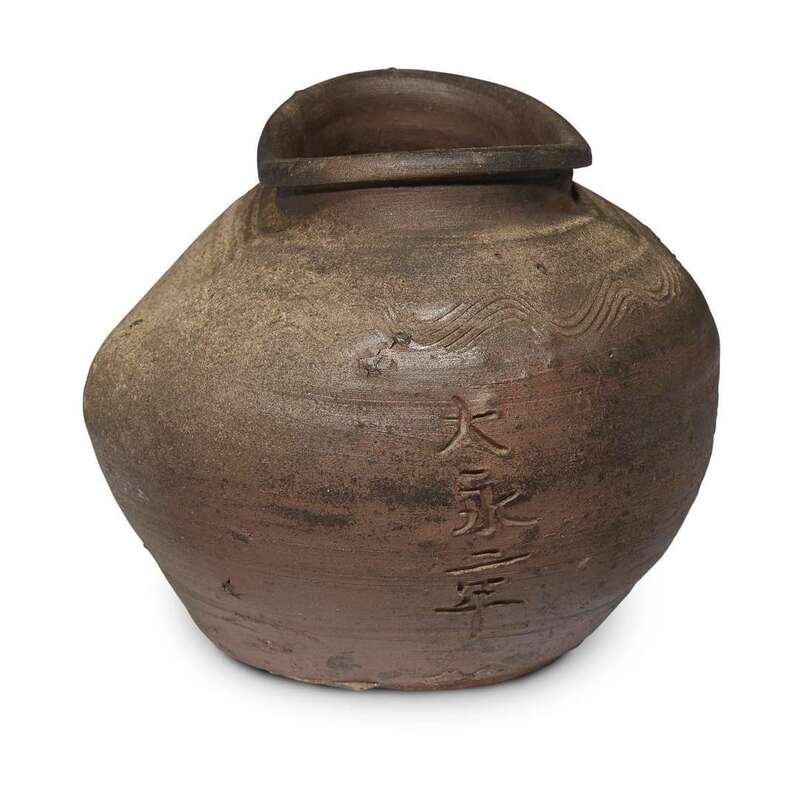 Of dark reddish brown tone, the irregularly shaped, rounded body incised with swirl lines around shoulder and inscribed with "daiei ninen" (ca. 1522) on body.