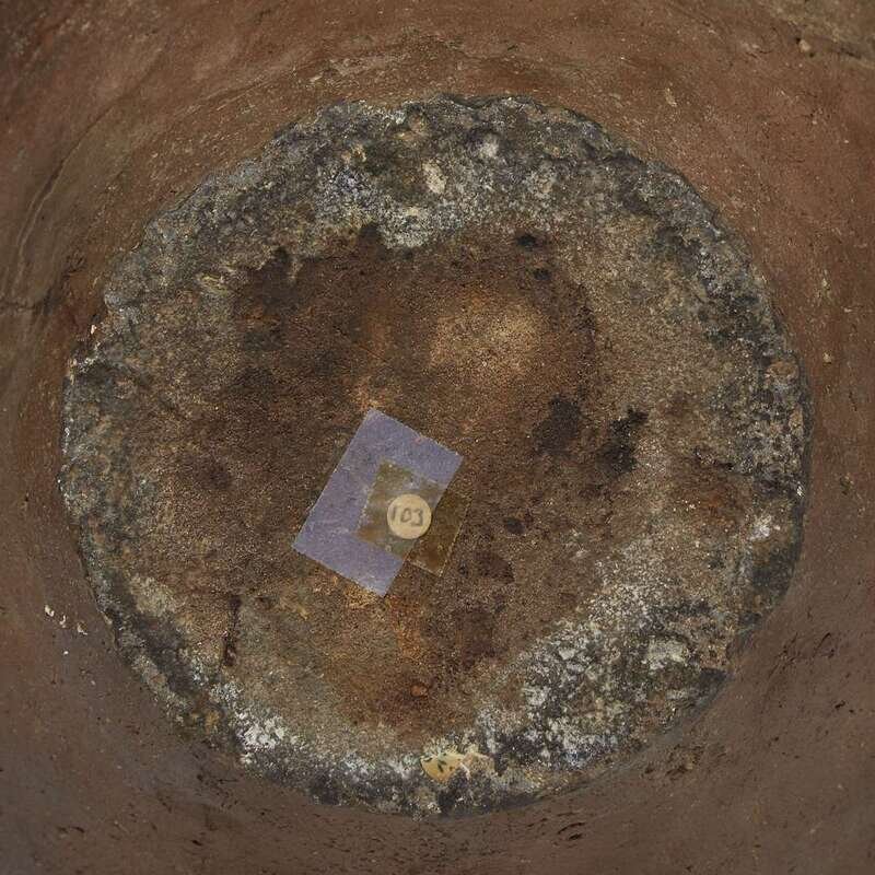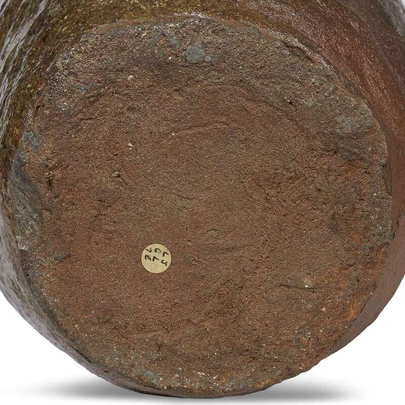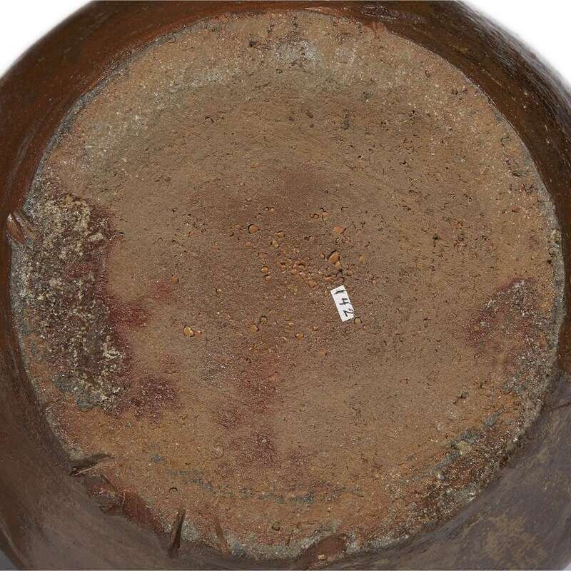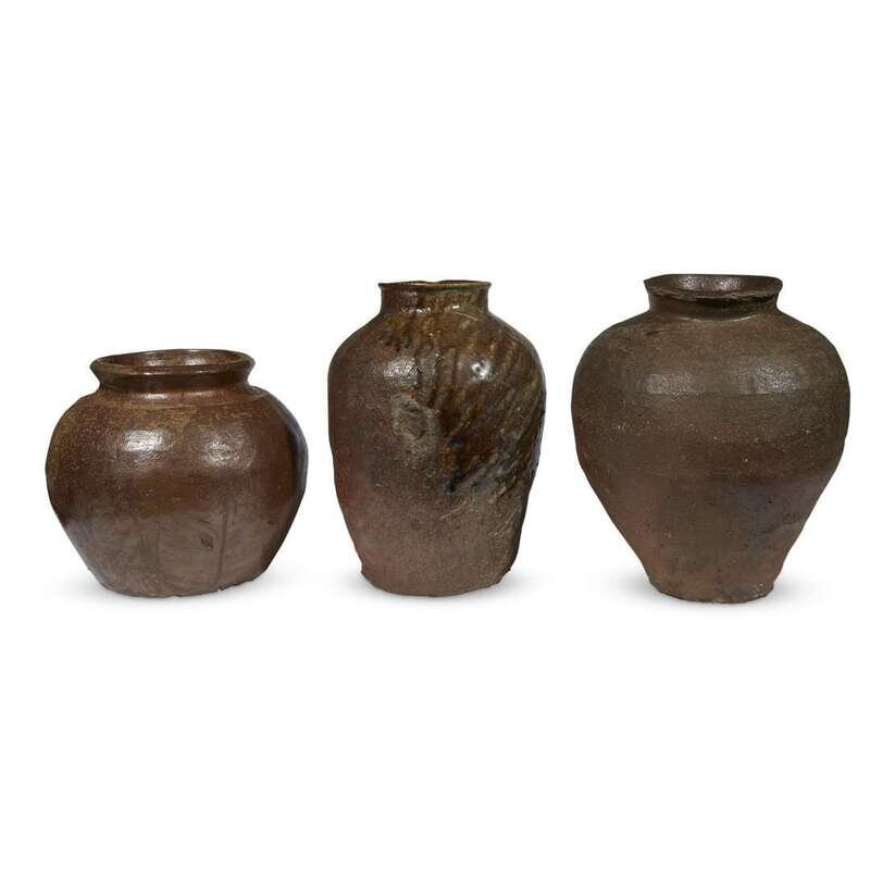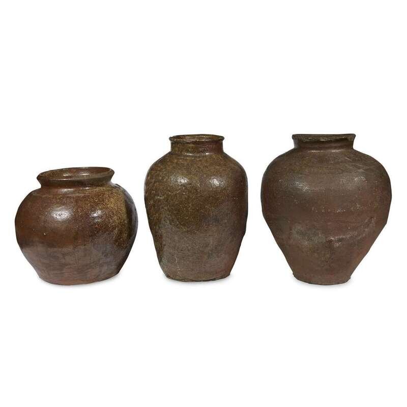 Comprising: a jar, possibly Tokoname, early Edo period, with a high-shouldered body suppporting a waisted neck and chipped lipped rim, potter's mark incised to shoulder; a similar jar, possibly Bizen or Tokoname, with a bulbous body; an ovoid jar with short neck, all of a rich red-brown body and areas of olive or olive-brown-toned ash glaze.