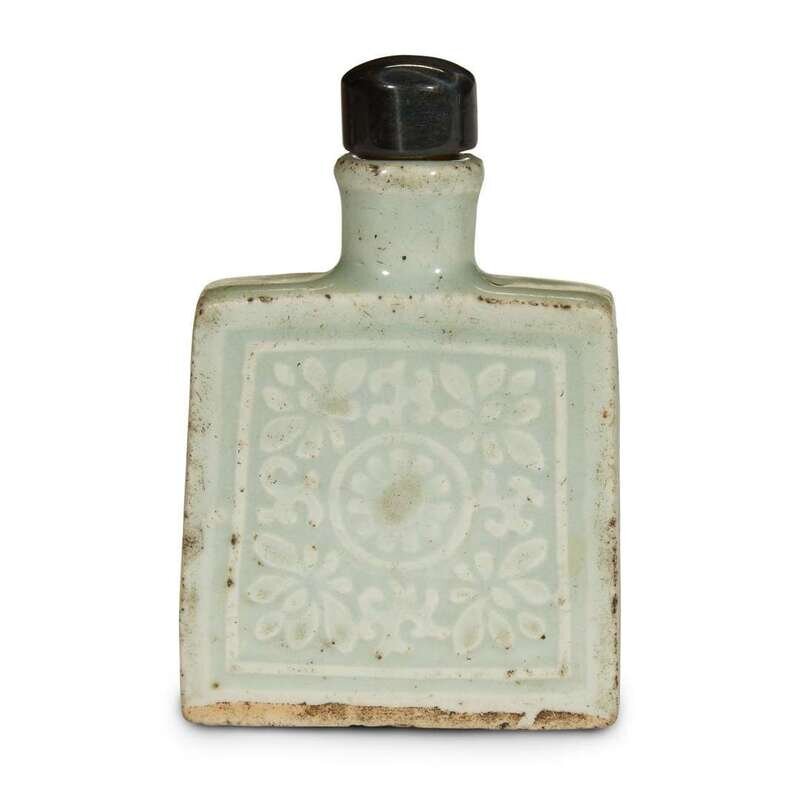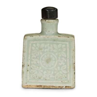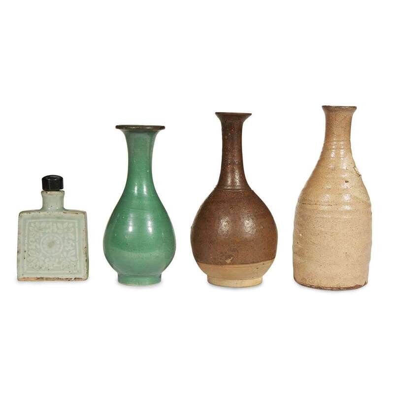 Comprising: a brown-glazed bottle vase, possibly Chinese, Tang dynasty, with a tall, slender neck and flared mouth; a Chinese green-glazed vase, possibly Kangxi period, with a pear-shaped body rising to a slender neck flaring at the rim; a beige-glazed bottle vase with a cylindrical body rising to a tapering neck; a Chinese molded celadon-glazed porcelain square molded snuff or medicine bottle decorated with floral motifs.