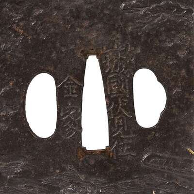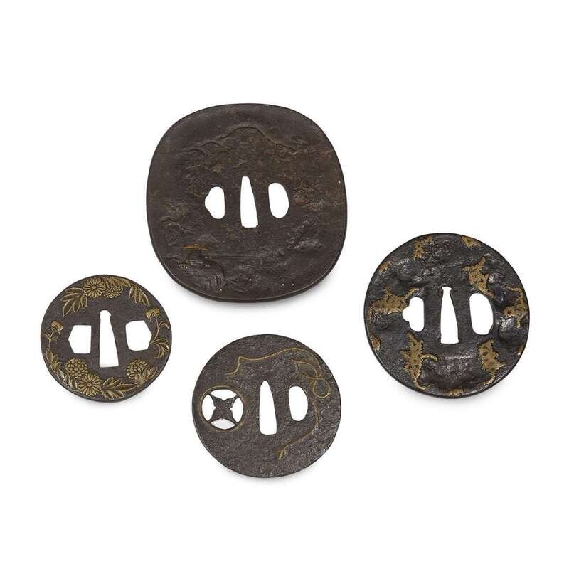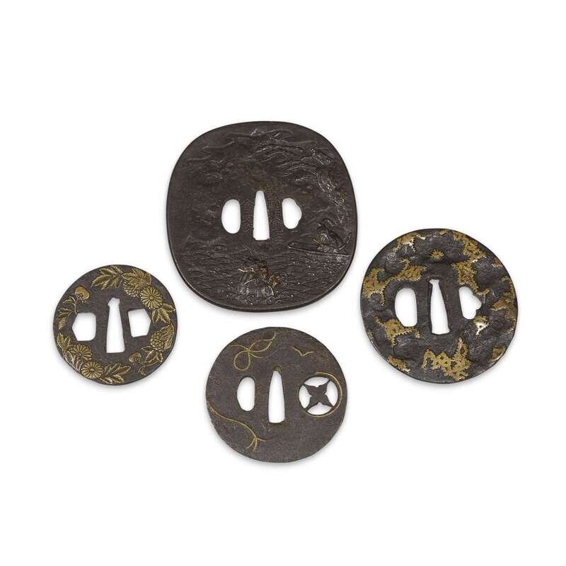 Comprising: an oversize example depicting the dragon king emerging from the ocean by a courtier in a boat, inscribed; a chrysanthemum-inlaid example; a pierced example with double-gourd motif; an irregular textured example.