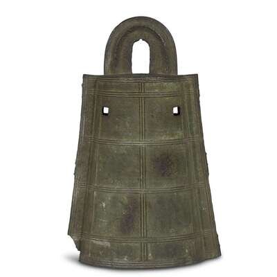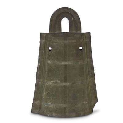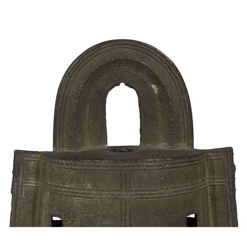 Cast with arch-shaped handle, the hollow body designed with rows of horizontal and vertical bands filled with crosshatch diagonal pattern.