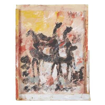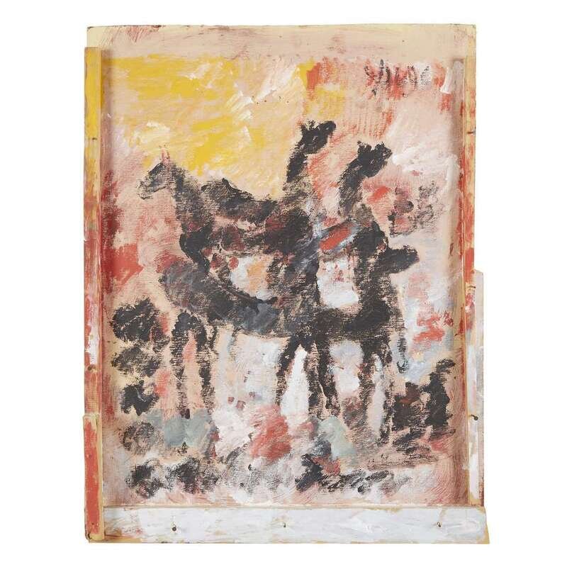 Signed, upper right, "Young," paint on repurposed wood and plywood construction, mounted for hanging.