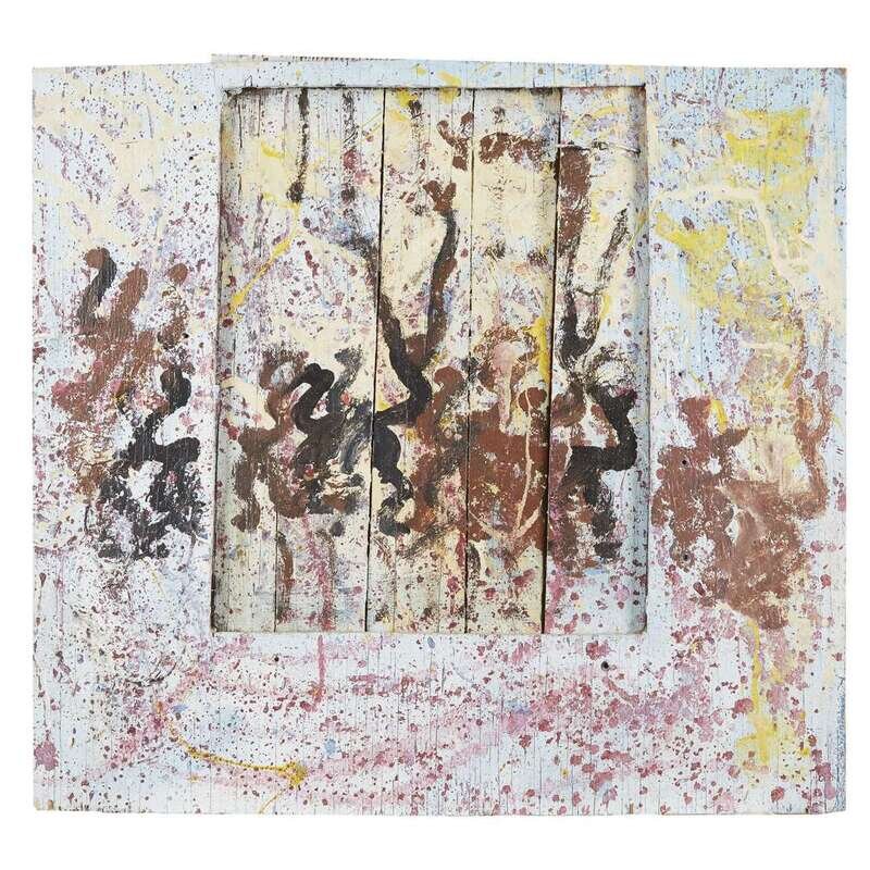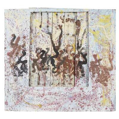 House paint on repurposed wood construction, mounted for hanging.