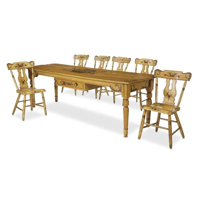 Yellow and polychrome painted and stenciled dining table and six accompanying chairs Pennsylvania, circa 18450, paint refreshed circa 1910
