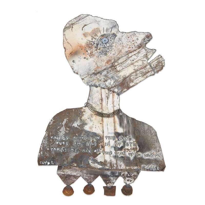 Cut signature, lower edge, "Clyde Angel," and cut inscription, "There's a Hole in the Sky / Puts the Blue in my Eye / Takes Me All of the Way Up to Heaven," additional graphite inscripton at top of head, "Enso...H," mixed media on cut-out metal, mounted for hanging.
