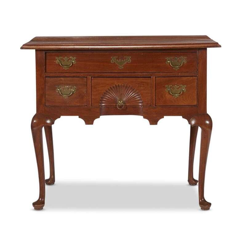 With a blocked and fan-carved center drawer on cabriole legs ending in pad feet.