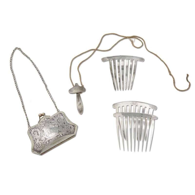 Including a cloak pin engraved with the initials, "SE," probably for Sarah Cadwallader Eastburn (1806-1885), with impressed mark of R. & W. Wilson; two hair combs engraved, "MCE," for Mary Cadwallader Eastburn (1832-1917) and another comb engraved, "AJM," for Anna Jennie Moon (1864-1932); and a silver purse engraved, "AMR," for Dr. Anna Moon Randolph and inscribed, "Presented by The Newport News Medical Society Elected to Life Honorary Membership July 2nd 1907."