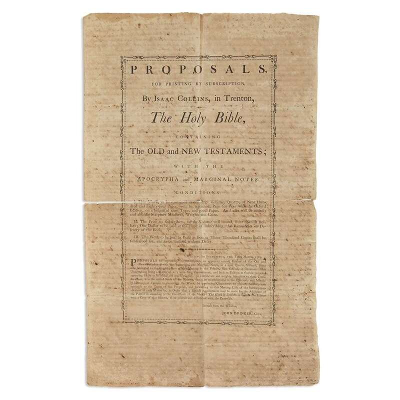 A letterpress broadsheet prospectus, "Proposal for Printing by Subscription, By Isaac Collins, in Trenton, The Holy Bible" 1789