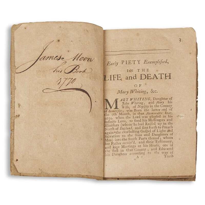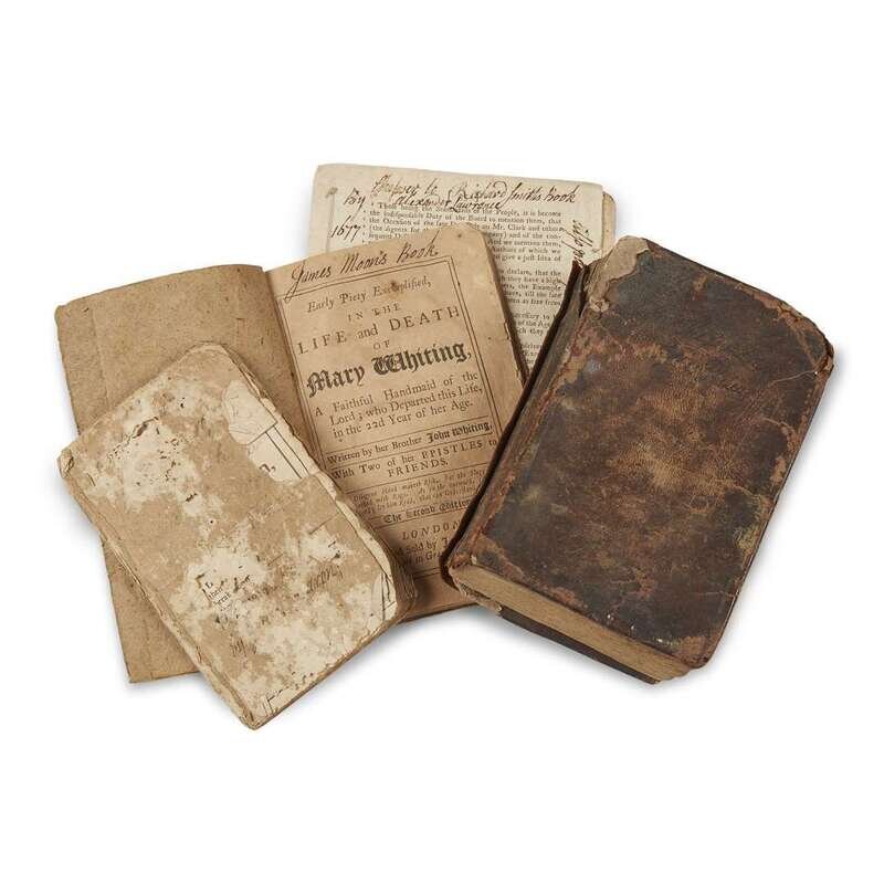 Including James Alexander, "An Answer to a Book published by Richard Smith of Westchester. Wherein the People of God called Quakers are cleard from the wrong...charged upon them," probably London, 1677; the second, Thomas Ellwood, "The Foundat[tion] of Tythes Shaken," 1678; the third, John Whiting, "Early Piety Exemplified in the Life and Death of Mary Whiting...with Two of her Epistles to Friends," J. Sowle, London, 1711; and the fourth, John Bancroft, " A Faithful Warning to the Inhabitants of Great-Britian and Ireland, Samuel Fairbrother, Dublin, 1720, bound with Jane Fearson, "Universal Redemption Offered in Christ, In Opposition to That Pernicious and Destructive doctrine of Election," 1693.