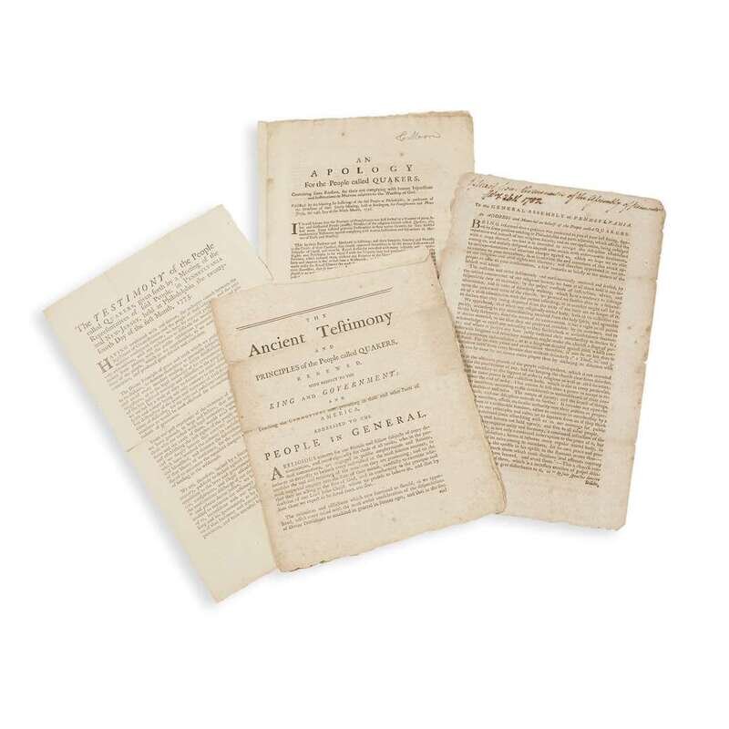 Including two copies, "An Apology for the People called Quakers, Containing some Reasons for their not complying with human Injunctions and Institutions in Matters relative to the Worship of God," James Chattin, Philadelphia, 1757- letterpress signature of James Pemberton; a broadside, "From our Meeting for Sufferings, Held in Philadelphia, the 23rd of the Third Month, 1771," letterpress signature of John Pemberton, clerk; two copies of the broadside: "Testimony of the People called Quakers, given forth by a Meeting of the Representatives of said People, in Pennsylvania and New-Jersey, held at Philadelphia the twenty-fourth of the first Month, 1775," letterpress signature of James Pemberton, clerk; "The Ancient Testimony and Principles of the People called Quakers, Renewed, with respect to the King and Government; and touching the Commotions now prevailing in these and other Parts of America," letterpress signature of John Pemberton, clerk; Anthony Benezet, "Serious Reflections affectionately recommended to the Well-disposed of every Religious Denomination...," ; two copies of "To the President and Executive Council, The General Assemblfy of Pennsylvania, and others whom it may concern; The following Representations on Behalf of the People called Quakers," letterpress signature of John Drinker, clerk; and two copies of "To the General Asse of Pennsylvania. An Address and Memorial on behalf of the People called Quakers," letterpress signature of John Drinker, clerk. 12 pieces. .