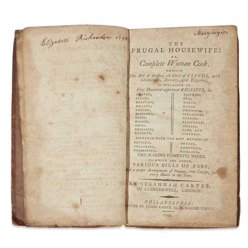 Susannah Carter, "The Frugal Housewife: or, Complete Woman Cook" James Carey, Philadelphia, PA, 1796