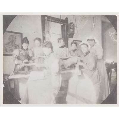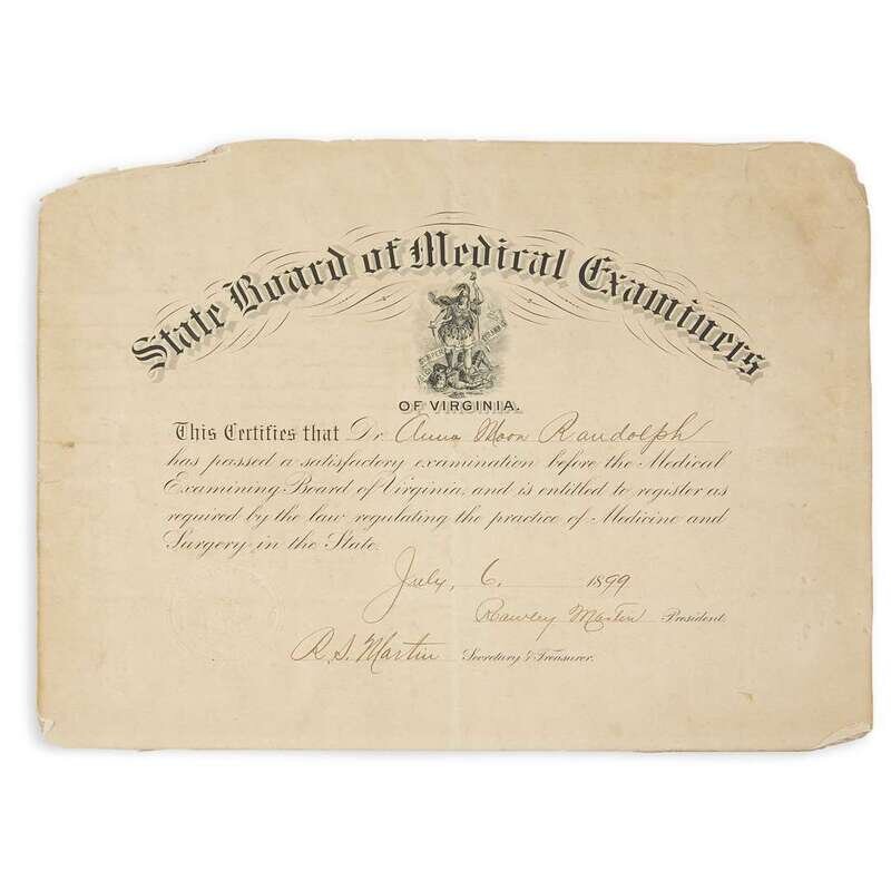 The scale with weights; the microscope accompanied by assorted botanical and entomological slides, together with two photographs, dated February 1, 1895,showing Anna Moon Randolph in the anatomical laboratory at the Women's Medical College of Pennsylvania; a State Board of Medical Examiner's of Virginia certificate issued in 1899 to Dr. Randolph, and several other items.
