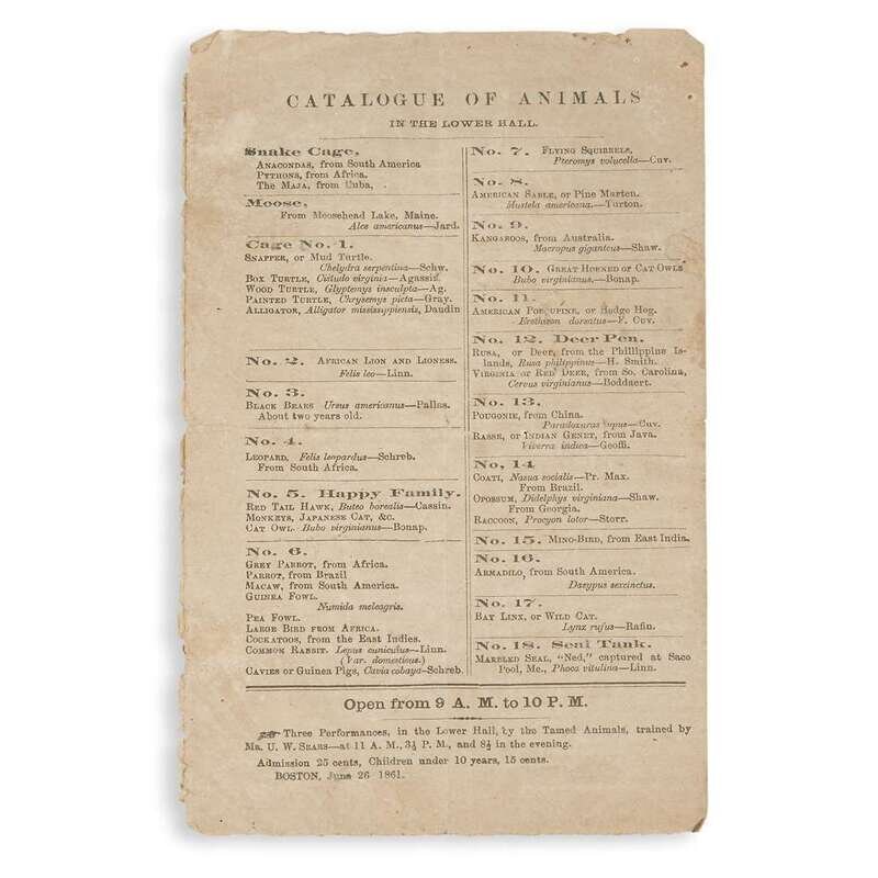 One letterpress item on early American zookeeping Boston, MA, June 26, 1861