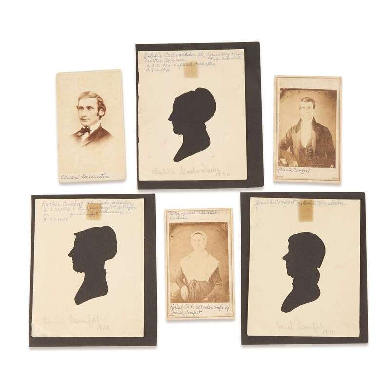 Including silhouettes and cartes-de-visite taken in Trenton, New Jersey of Josiah Comfort and Rachel Cadwallader Comfort (1802-1858), identified and dated 1836, and silhouette of Laetetia Cadwallader (1804-1876) and a carte-de-visite of her son Edward Balderston (1834-1879), unframed.