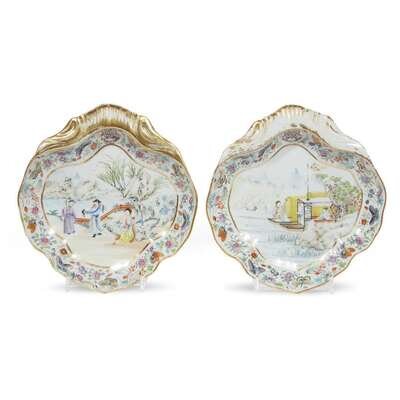 A pair of Chinese export rose mandarin armorial shrimp dishes 18th century