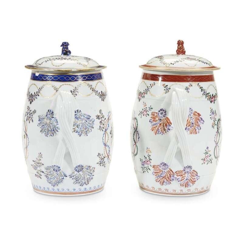 Of the same size and form, and with ribboned floral decoration; one in famille rose palette, the other in gilt-enriched cobalt palette. (2).