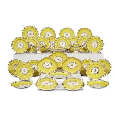 A Derby parcel-gilt yellow ground heraldic porcelain part luncheon service circa 1800-1815