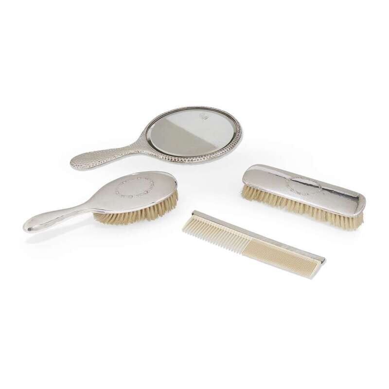 Comprising a sterling silver mirror, William Devenport, Birmingham, England, 1911; an unmarked sterling silver comb, stamped 925; and two continental silver brushes stamped, "VCh 830S." (4).