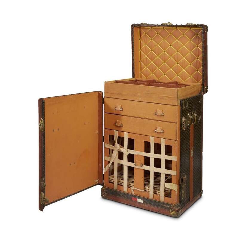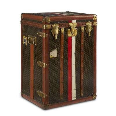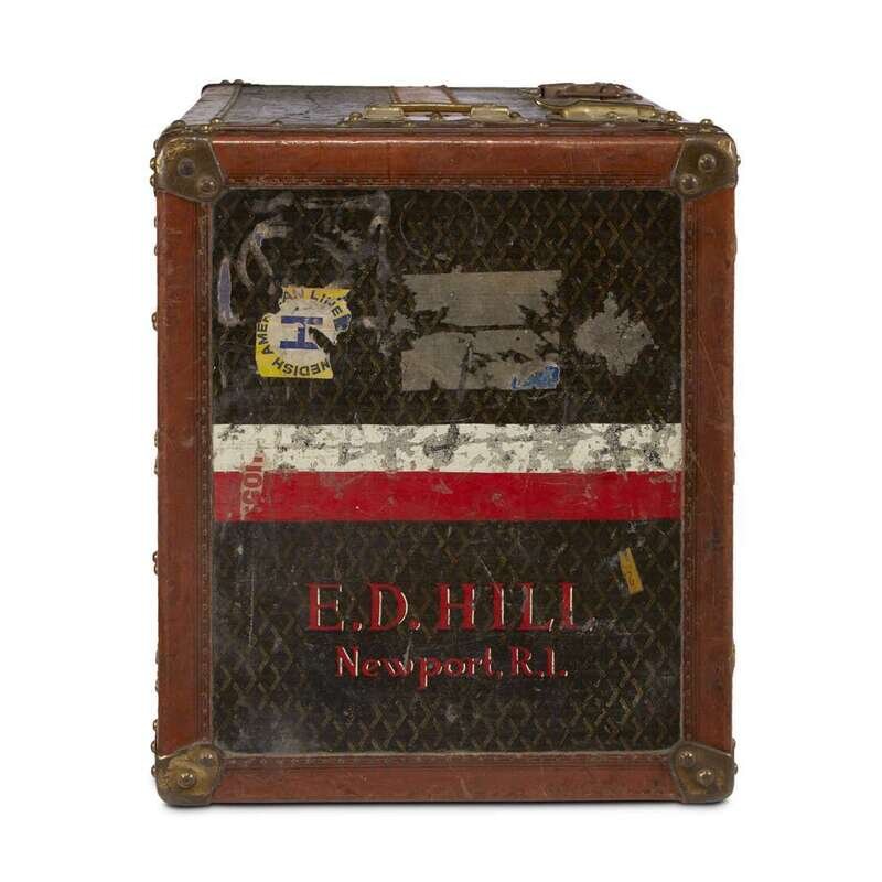 The sides mounted with original Malles Goyard metal labels, the interior fitted with orange leather lining and tabac baize compartments with movable spacers likely for shoes, above a removable webbed boot compartment, together with four custom dividers possibly later ordered from or rewebbed by Louis Vuitton; the exterior painted with red and white stripe and "E.D. Hill, Newport, R.I.", and affixed with labels for the Swedish American Line, the whole with original hardware, the locks stamped "Goyard Aine," the handles stamped with the Goyard cypher.