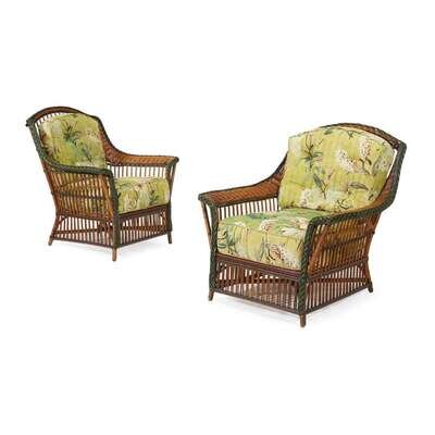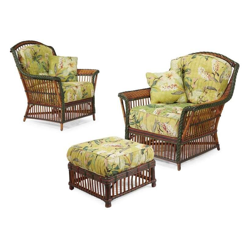 A near pair of polychrome painted rattan lounge chairs and an ottoman american, circa 1900
