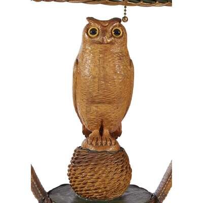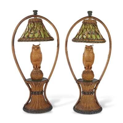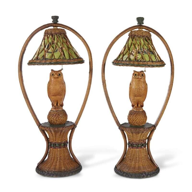 A pair of polychrome painted, carved wood and fabric-lined tables lamps with owls american, circa 1900