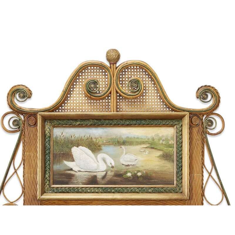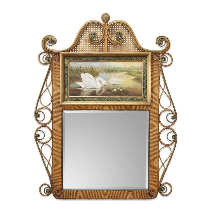 A large polychrome painted rattan and cane mirror with swans american, circa 1900
