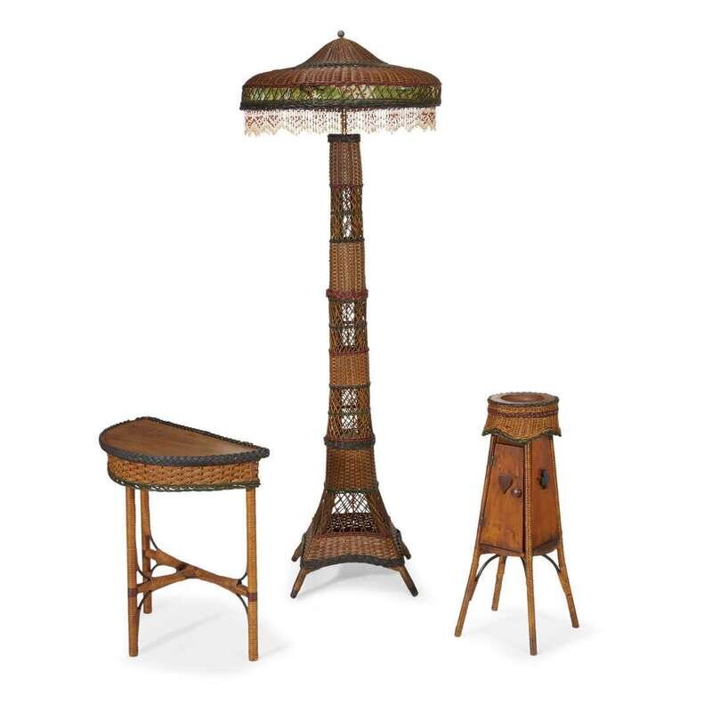 A polychrome painted wicker floor lamp, demilune side table and smoker's stand american, circa 1900