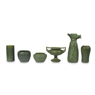 Hampshire pottery collection of six matte green vases, keene, nh, early 1900s