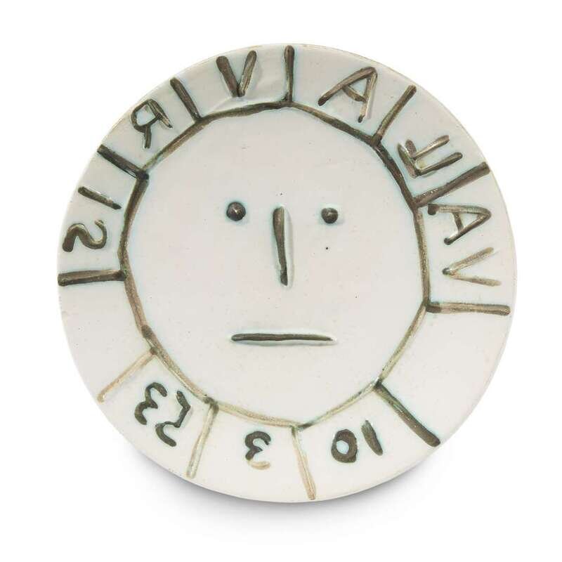 1953, from the edition of 400, with the 'EMPREINTE ORIGINALE DE PICASSO' and 'MADOURA PLEIN FEU' stamps on the underside. White earthenware clay plate with engraving and oxidized paraffin under white enamel.